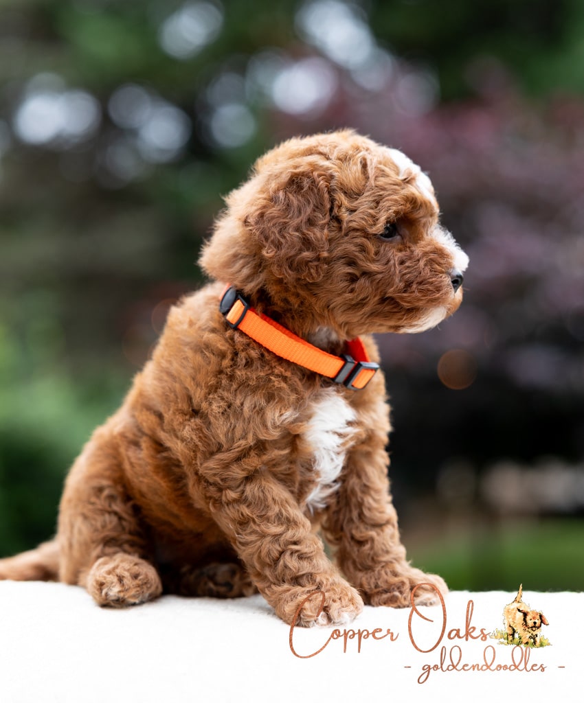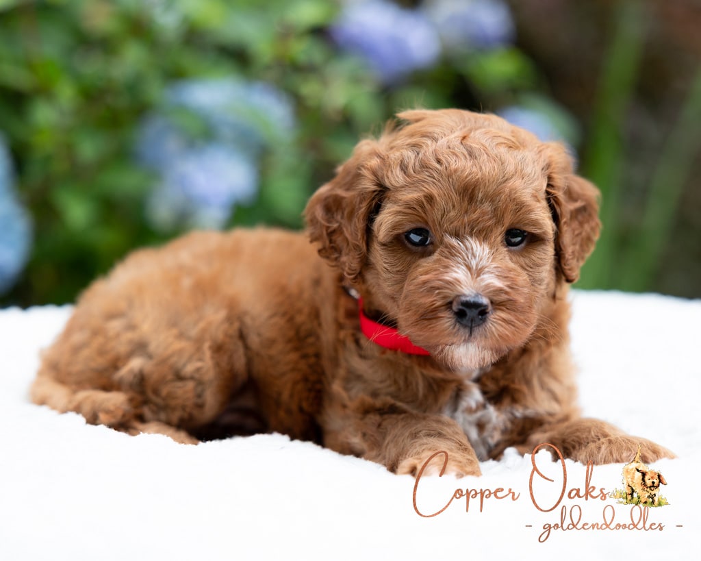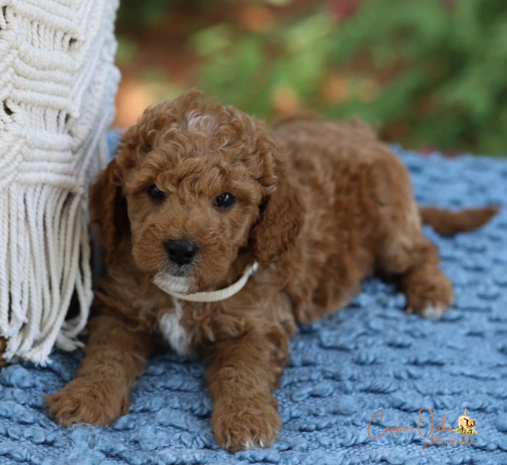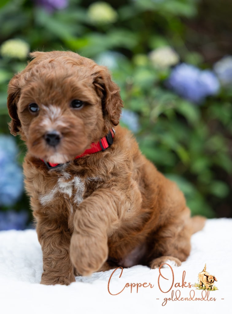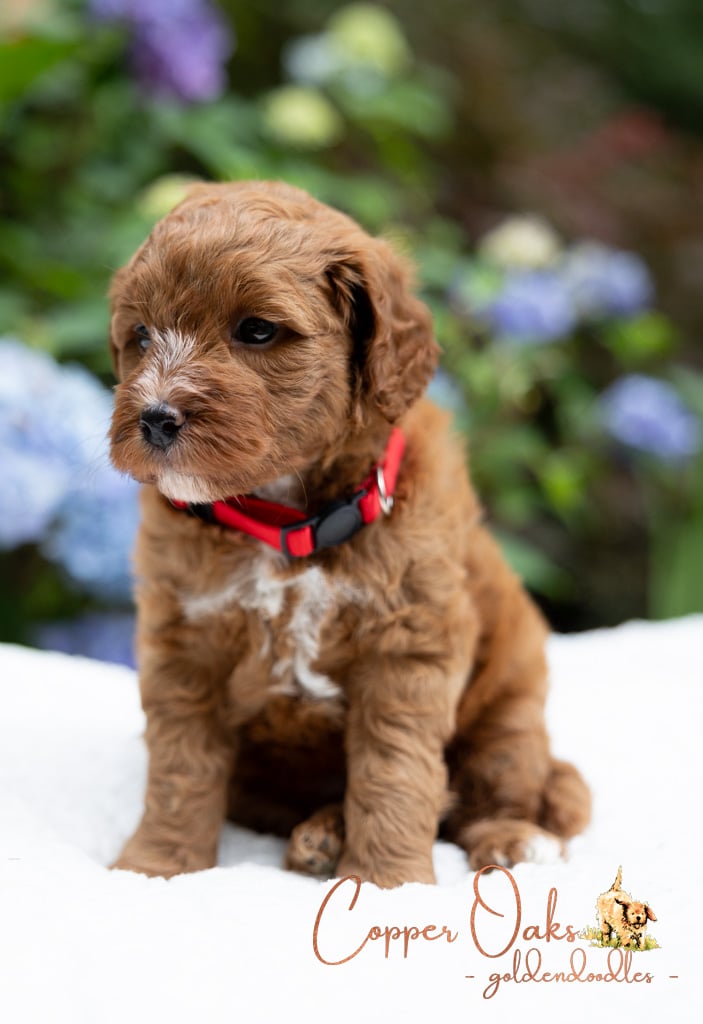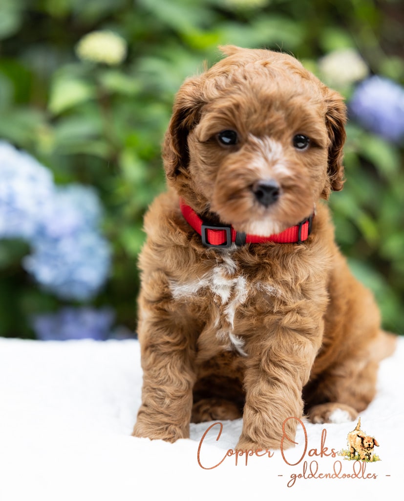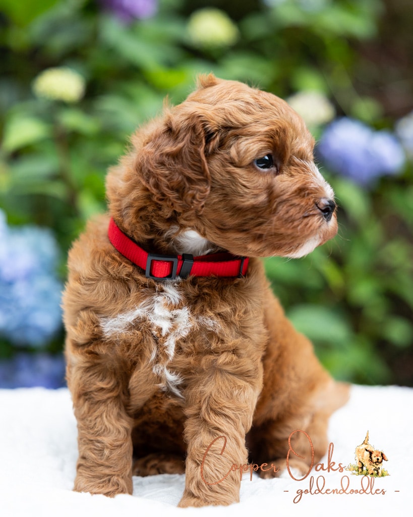 Magnolia is a perfect 22 pound F1b Mini Goldendoodle. She loves to explore the yard and say hello to the chickens. We love her deep red coloring and white marking on her chest resembling a flower. She has a great curly coat that is low to non-shedding.