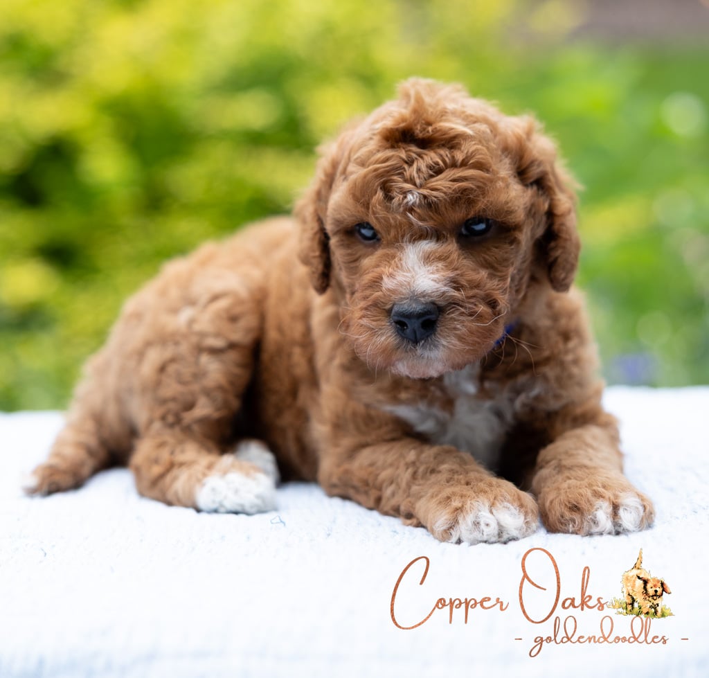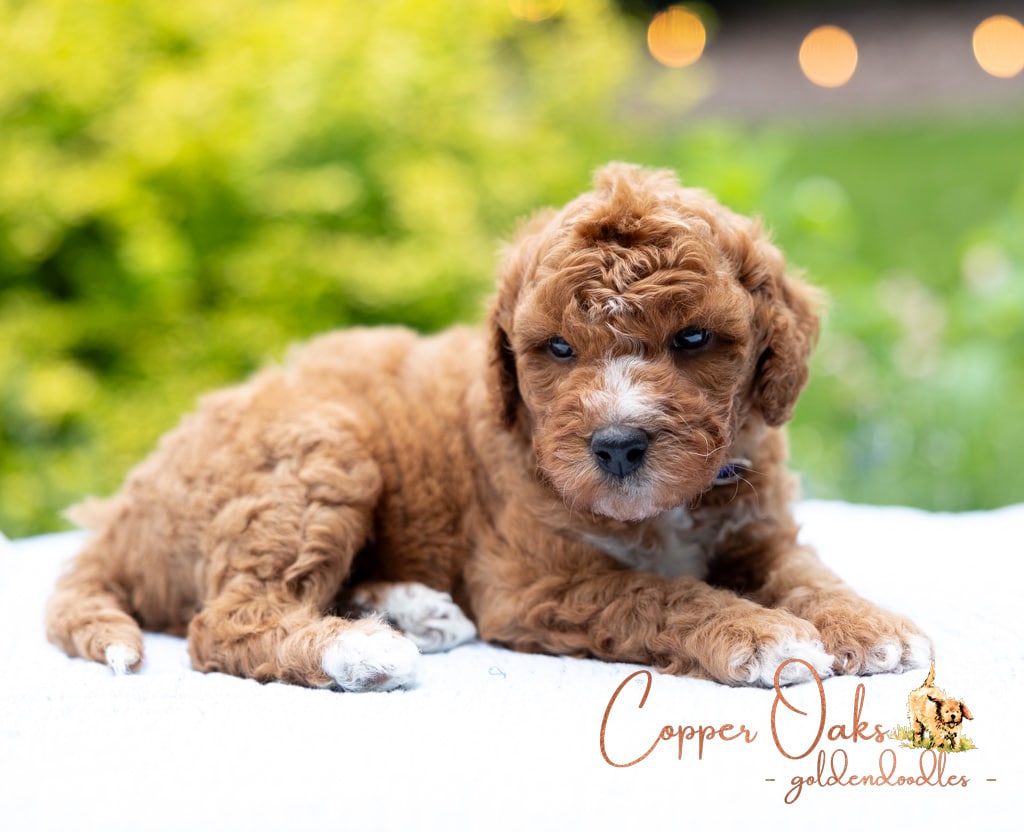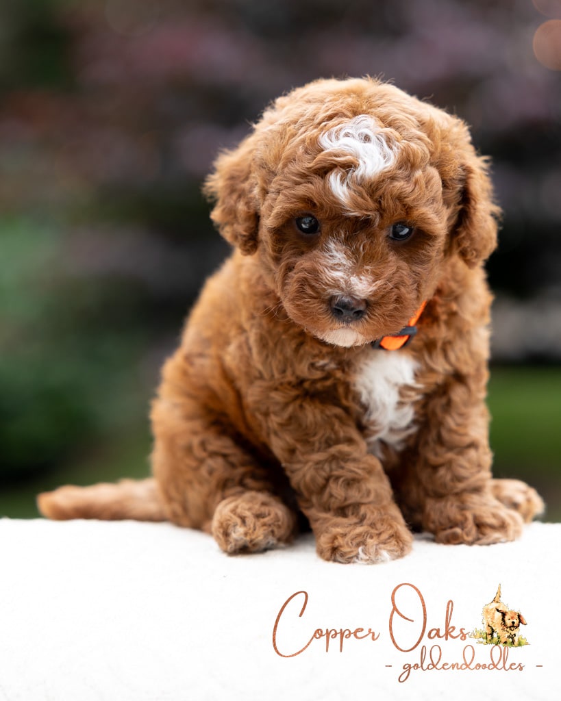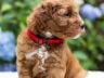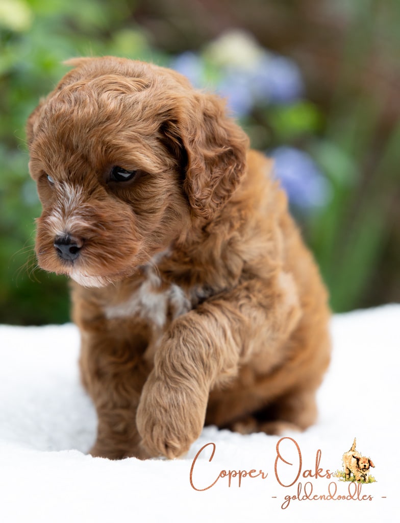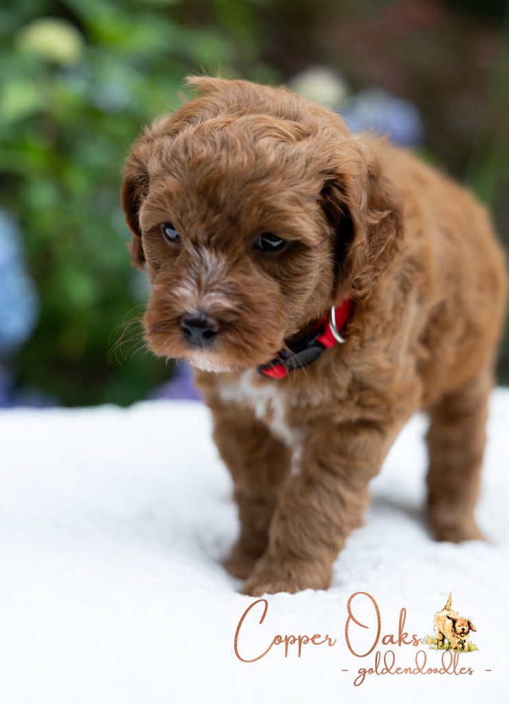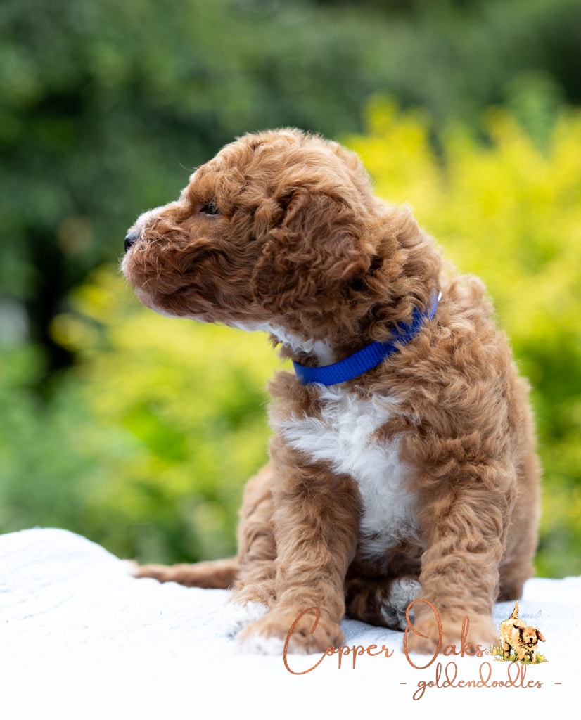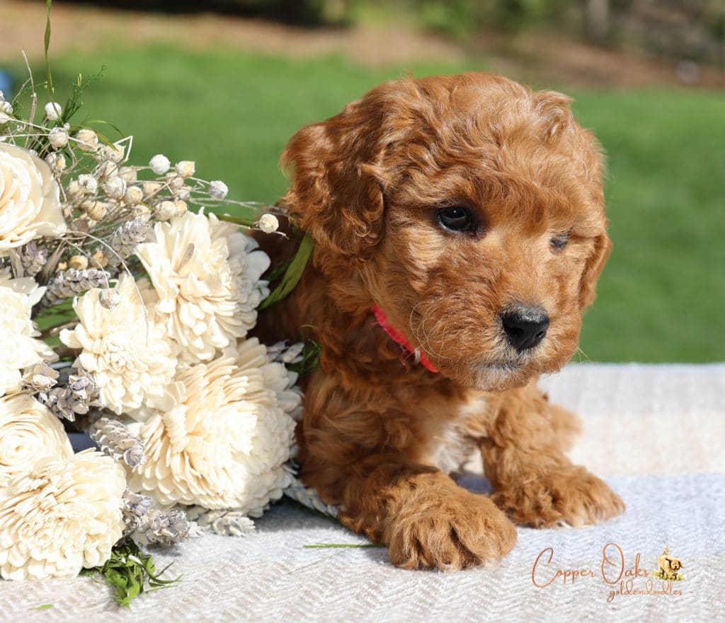 Magnolia is a perfect 22 pound F1b Mini Goldendoodle. She loves to explore the yard and say hello to the chickens. We love her deep red coloring and white marking on her chest resembling a flower. She has a great curly coat that is low to non-shedding.
