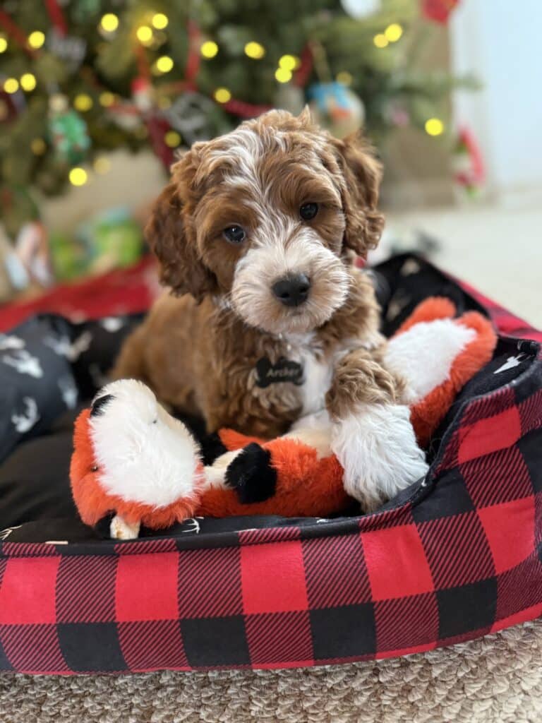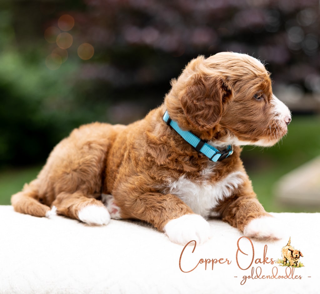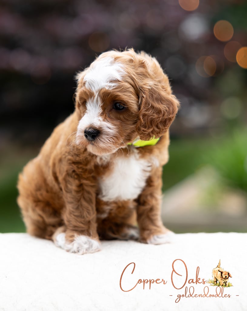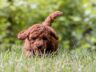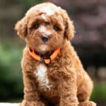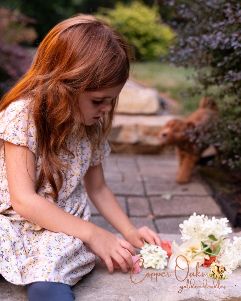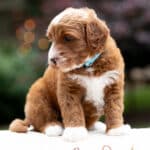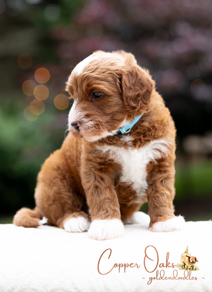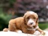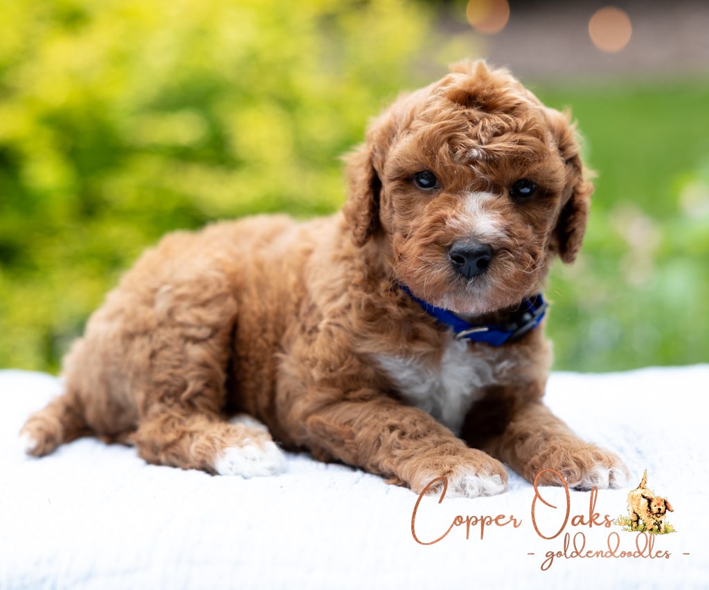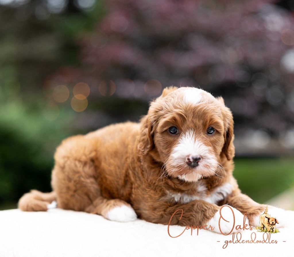Magnolia is a perfect 22 pound F1b Mini Goldendoodle. She loves to explore the yard and say hello to the chickens. We love her deep red coloring and white marking on her chest resembling a flower. She has a great curly coat that is low to non-shedding.