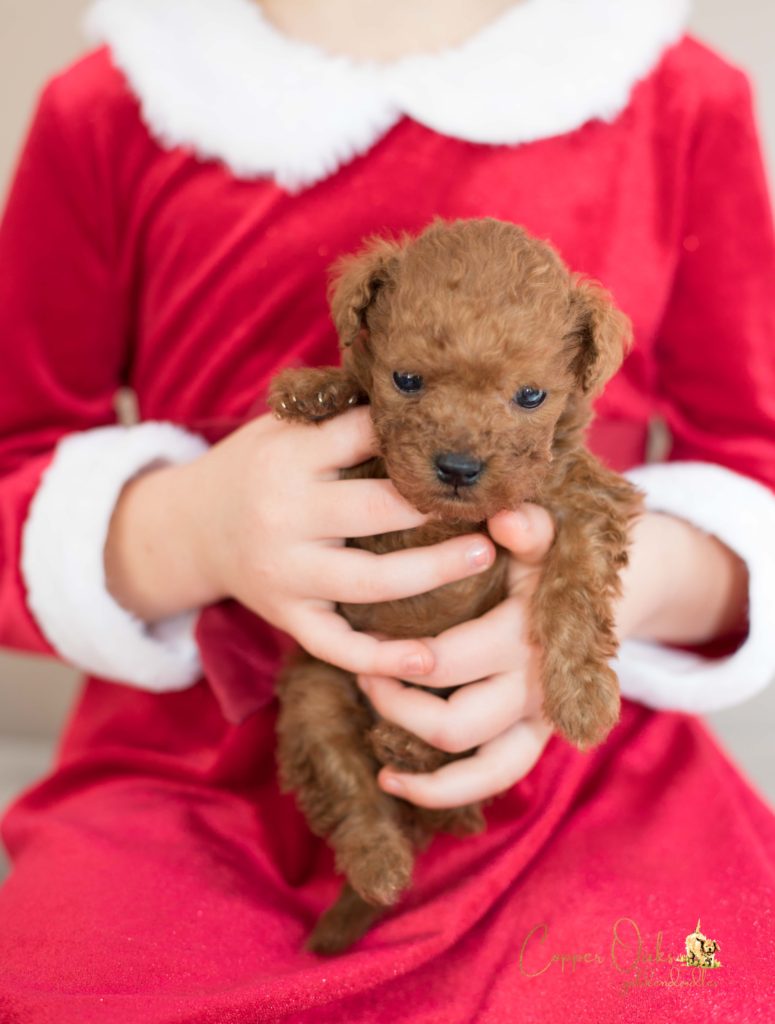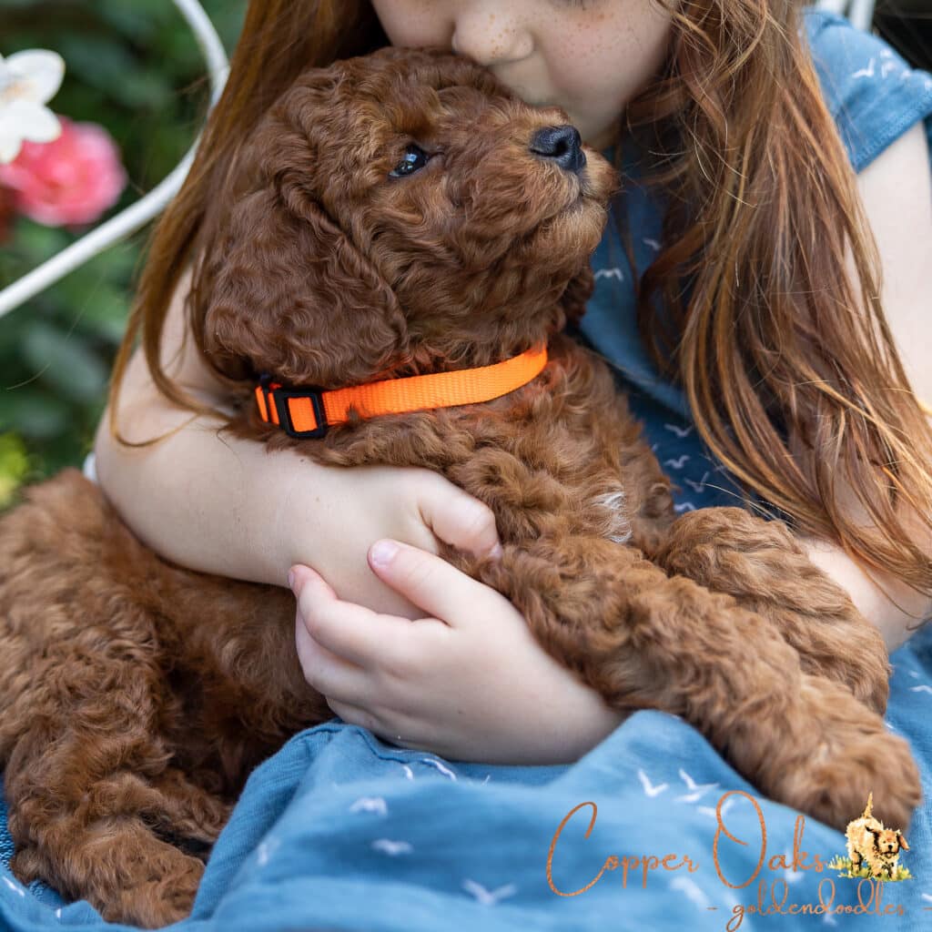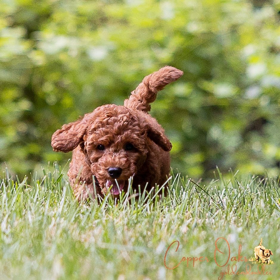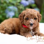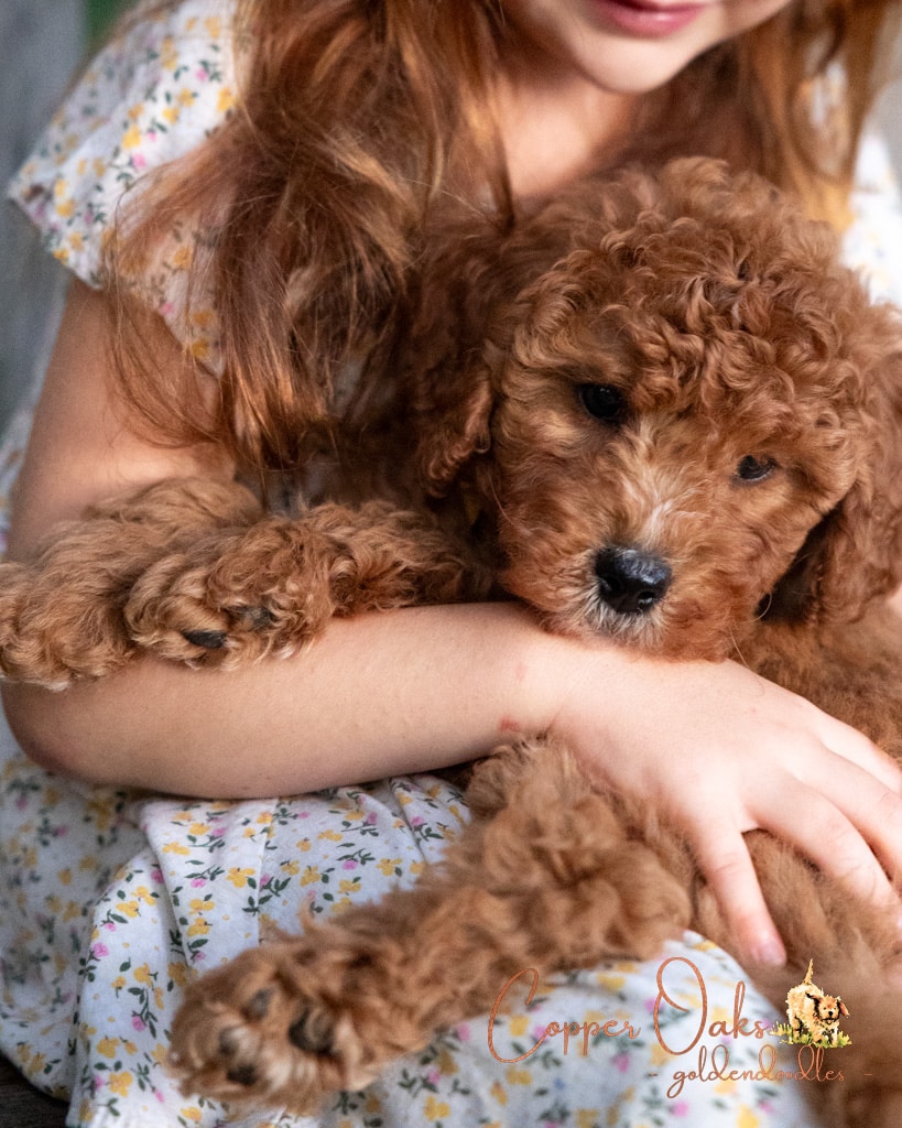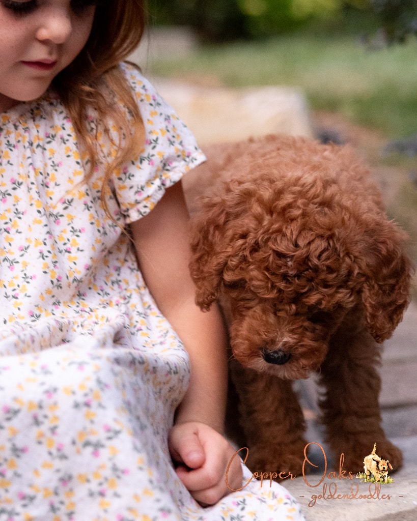 Maple is a lovely 20 pound F1b Mini Goldendoodle. She has a very sweet disposition a perfect family dog. Her deep red coloring and curly coat are beautiful and low to non-shedding. She is a gentle girl who likes to follow us around everywhere. Maple loves all the animals around our home and is a natural mother.